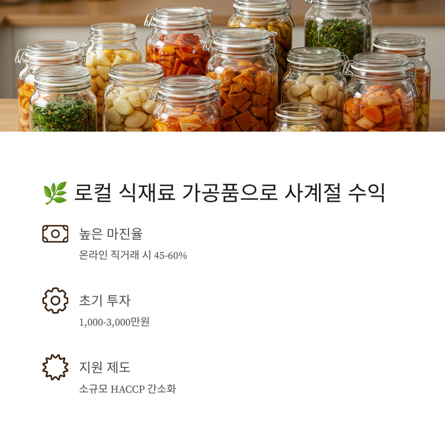 두 번째 추천 아이템은 지역 특산물을 활용한 가공식품 제조예요. 우리 지역에서 생산되는 농산물로 장아찌, 효소, 청, 말린 나물 등을 만들어 판매하는 방식이죠.