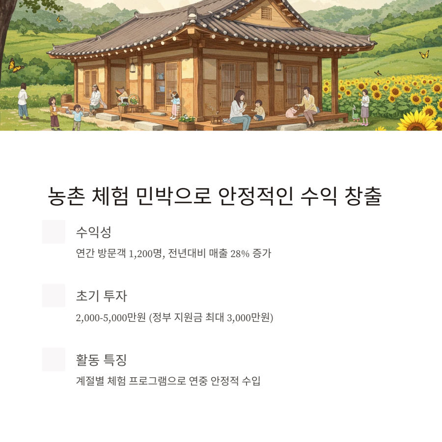 첫 번째로 추천드리는 아이템은 바로 농촌 체험 민박입니다. 요즘은 도시 가족들이 주말마다 농촌 체험을 찾아 떠나는 경우가 많아졌어요.