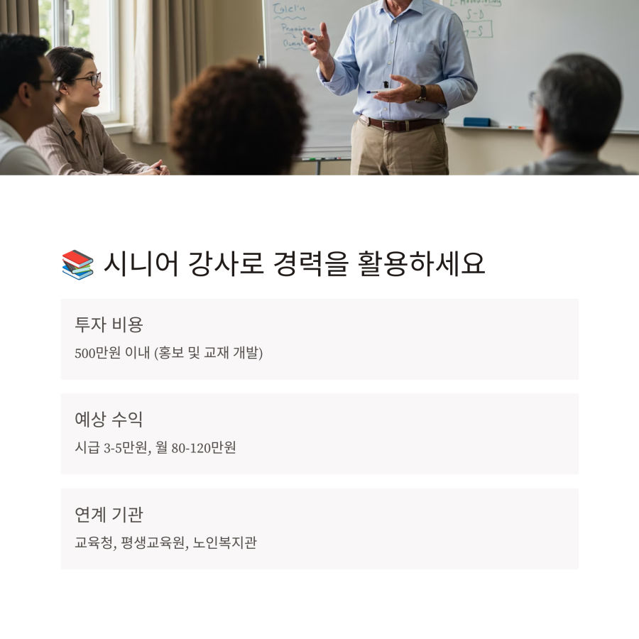 세 번째 추천 아이템은 시니어 강사 활동입니다. 60대가 되면 인생의 경험과 전문성이 축적되어 있죠. 이를 활용해 강의나 멘토링을 제공하는 거예요.