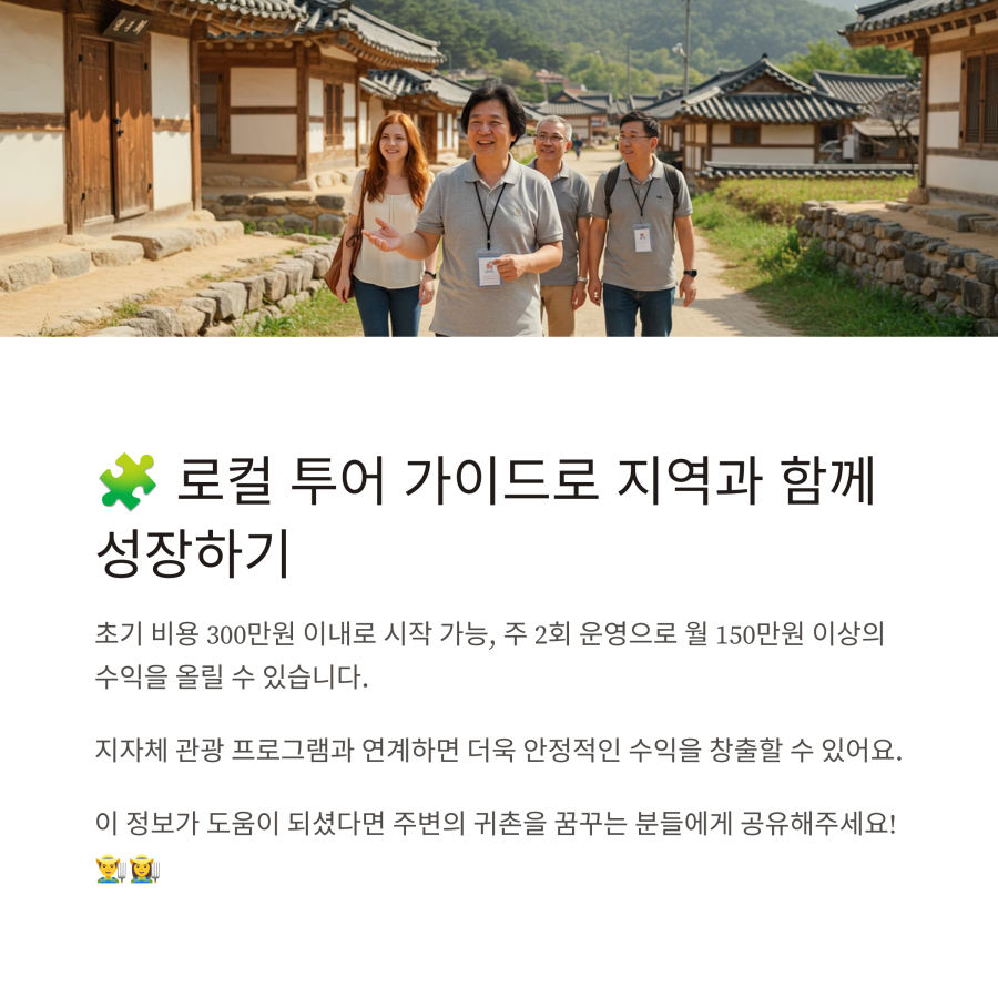 투어 가이드는 초기 비용이 거의 없고 걷기 좋은 코스만 선택하면 체력적으로도 무리가 없어요. 또한 지역 관광업체나 숙박업소와 제휴하면 안정적인 고객 확보도 가능하답니다.