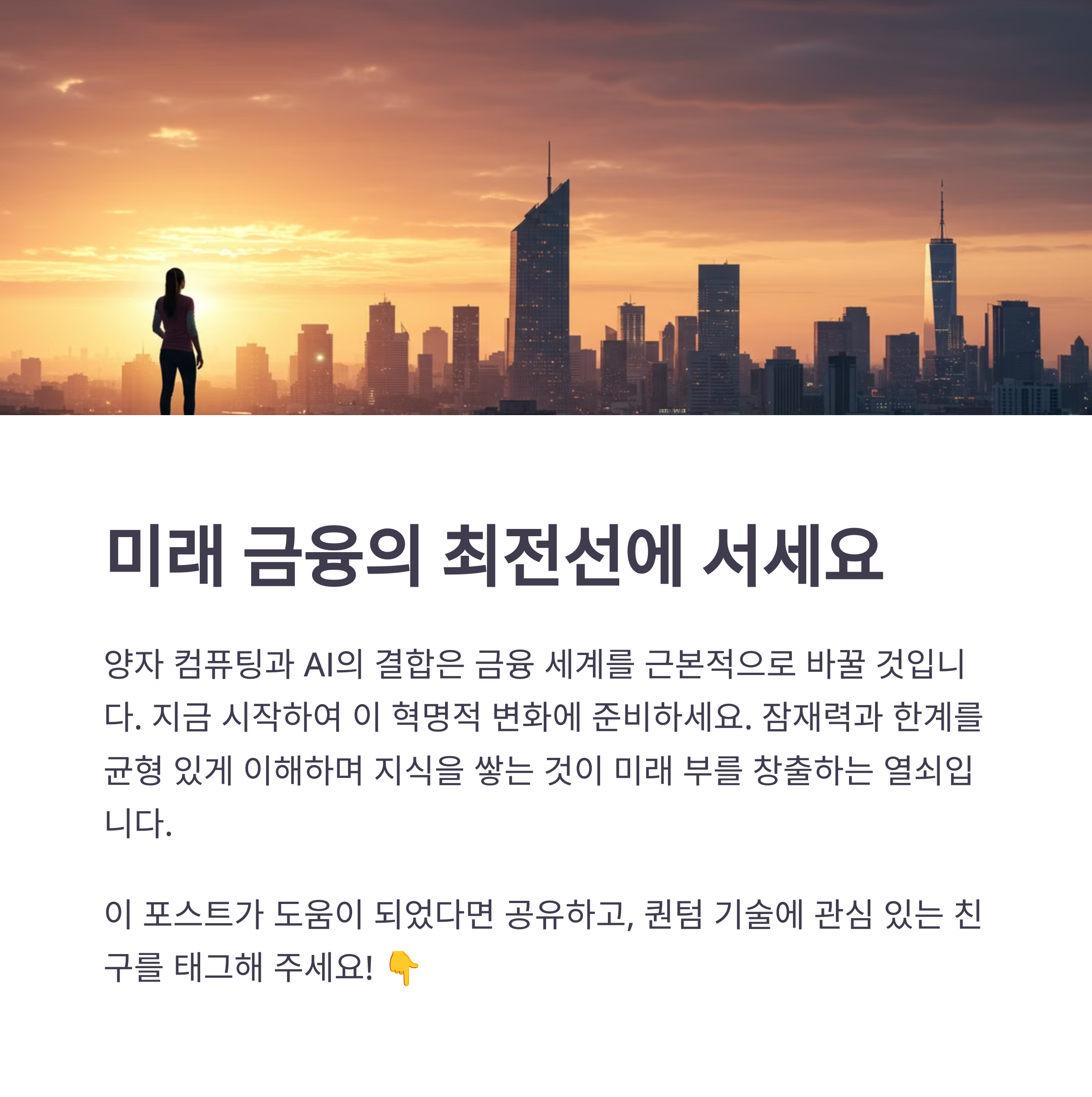 기술의 발전 속도는 예상보다 빠를 수도, 느릴 수도 있습니다. 하지만 확실한 것은 퀀텀 AI가 금융 시장의 판도를 바꿀 혁명적인 기술이라는 점입니다. 지금 관심을 가지고 준비한다면, 그 변화의 물결을 타고 새로운 기회를 잡을 수 있을 것입니다. 🌊